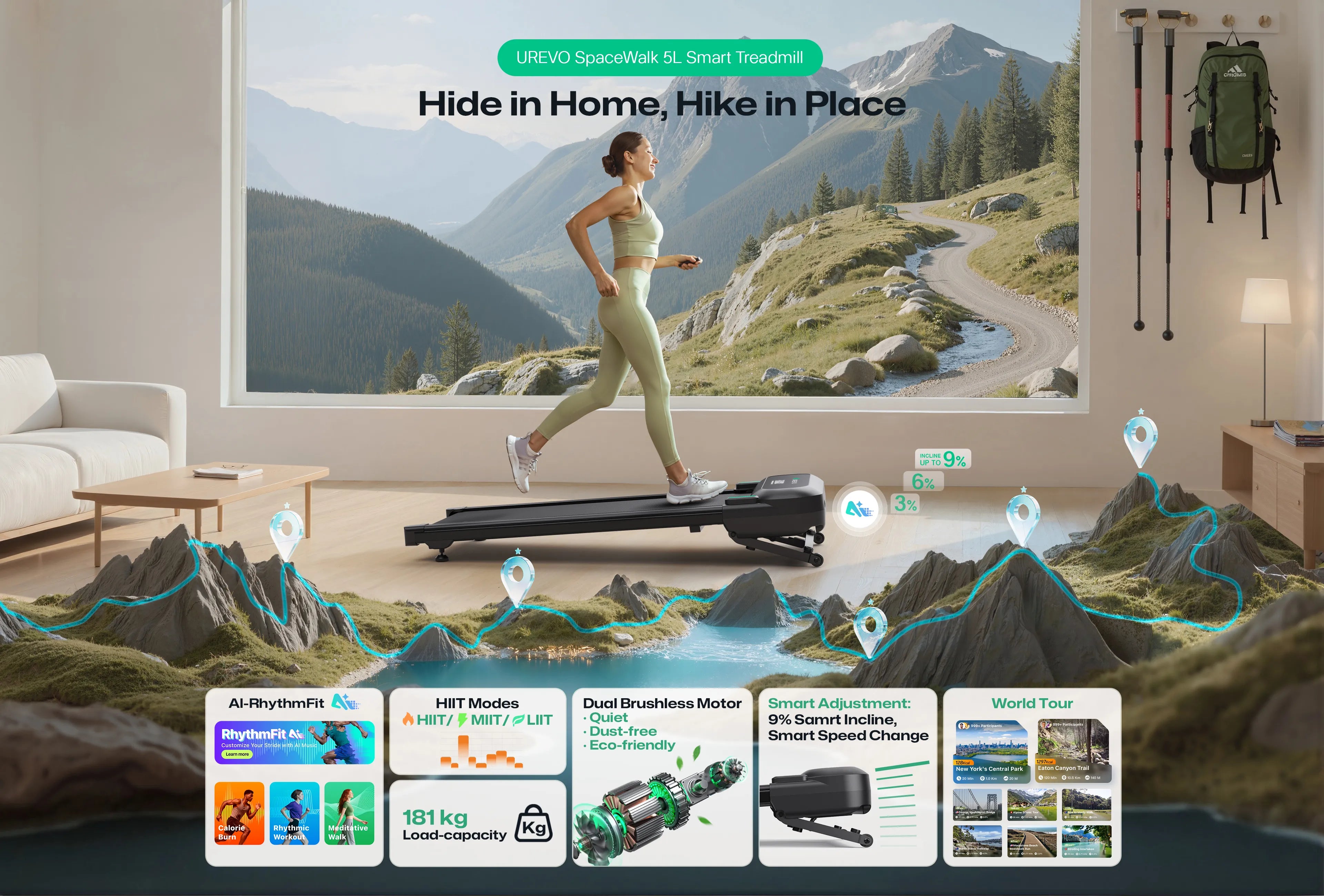 - Immersive Home Hiking: World Tour & Smart speed and incline adjustment, providing a fully immersive home hiking exercise.