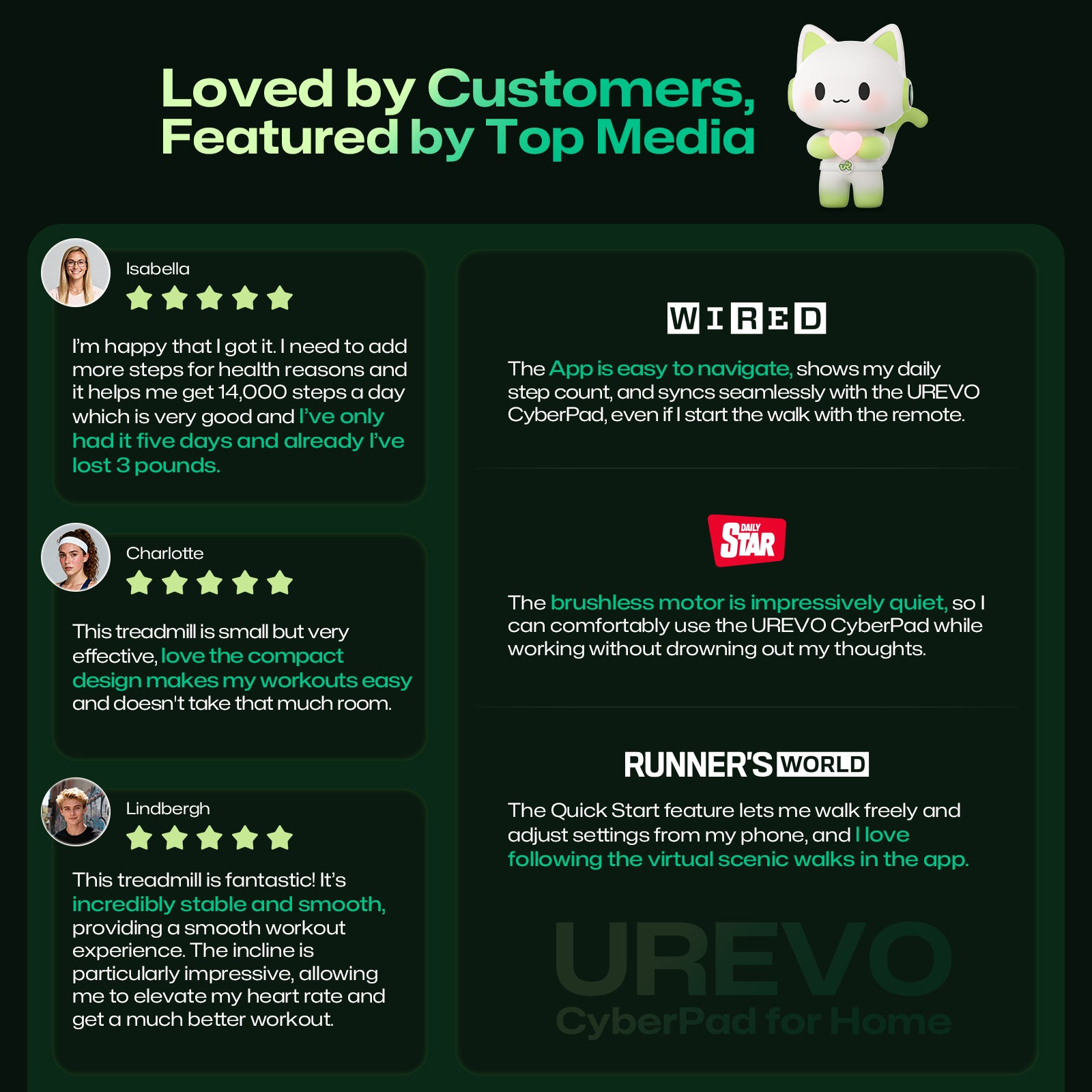 • UREVO Wellness Hub: Connect to the UREVO APP for outdoor run simulations and automatic incline adjustments. Customize fitness goals, track data accurately, and access four workout modes with free resources.